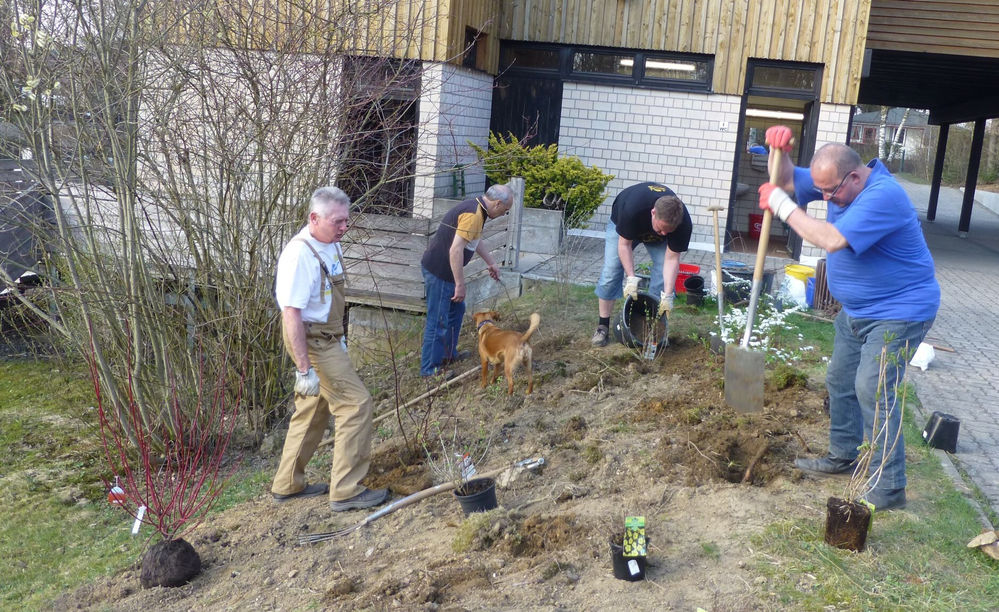 Spontan stellte Altbürgermeister Willi Koska (1.li.) Sträucher zur Verfügung und mit Hilfe von Gemeinderat Horst Börder(2.vli.), Bürgermeister Matthias Döhla (3.v.li) und Dieter Kittel (re.) wurde gepflanzt und neu angelegt.